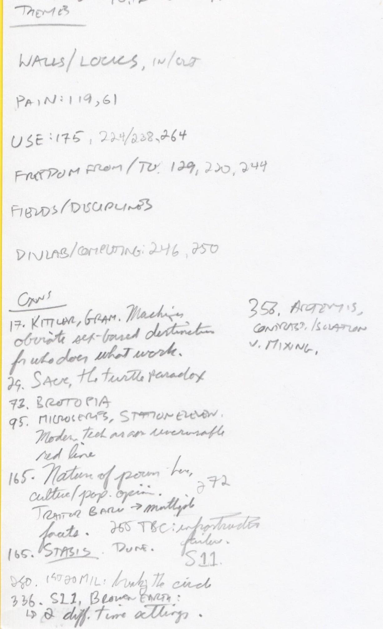 1. While reading: take notes in the blank pages of the book (or, if borrowing the book, on a separate page). Use page numbers to start each note item, rather than a numbered list, and create separate sections to list page references for important topics, themes, or connections to other works.