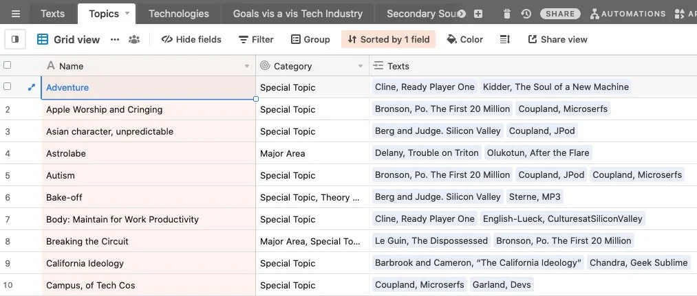 I’ve also starting putting these into an Airtable database. I have to confess, I hope this helps me, because it is quite fun to collect this stuff and see topic buckets like the below fill up. However, I confess that as I work on the database, it does feel like the part of this workflow that’s the most like fussing over something just for the sake of fussing.
