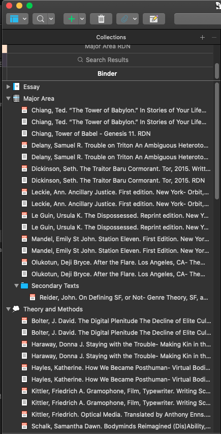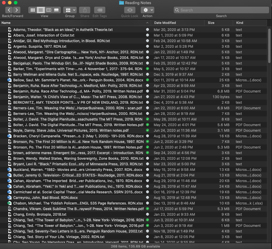 My reading notes folder contains all notes on nearly all works read from fall 2019 on, sorted by author last name—I figure that it makes more sense to have all of this in a pile than it does in subfolders for specific classes or projects. This way, if I’m doing a project and I want to be able to pull from these notes, I can just find the notes file and drag it into Scrivener, rather than thinking “What class did I read that in?” and then digging through my semester-based folder structure.