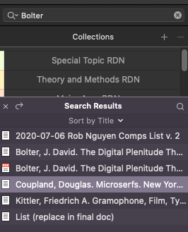 In Scrivener’s search field, click the magnifying glass dropdown arrow and select Search in:All. Typing into the search field will now populate with all items that include the search term anywhere in them. So in the below example, the notes I took on J. David Bolter’s book The Digital Plenitude appear, but all notes that mention Bolter by name appear also my notes on Douglas Coupland’s Microserfs and Friedrich Kittler’s Gramophone, Film, Typewriter. In both of those notes, I reference Bolter (albeit regarding Remediation and not The Digital Plenitude).