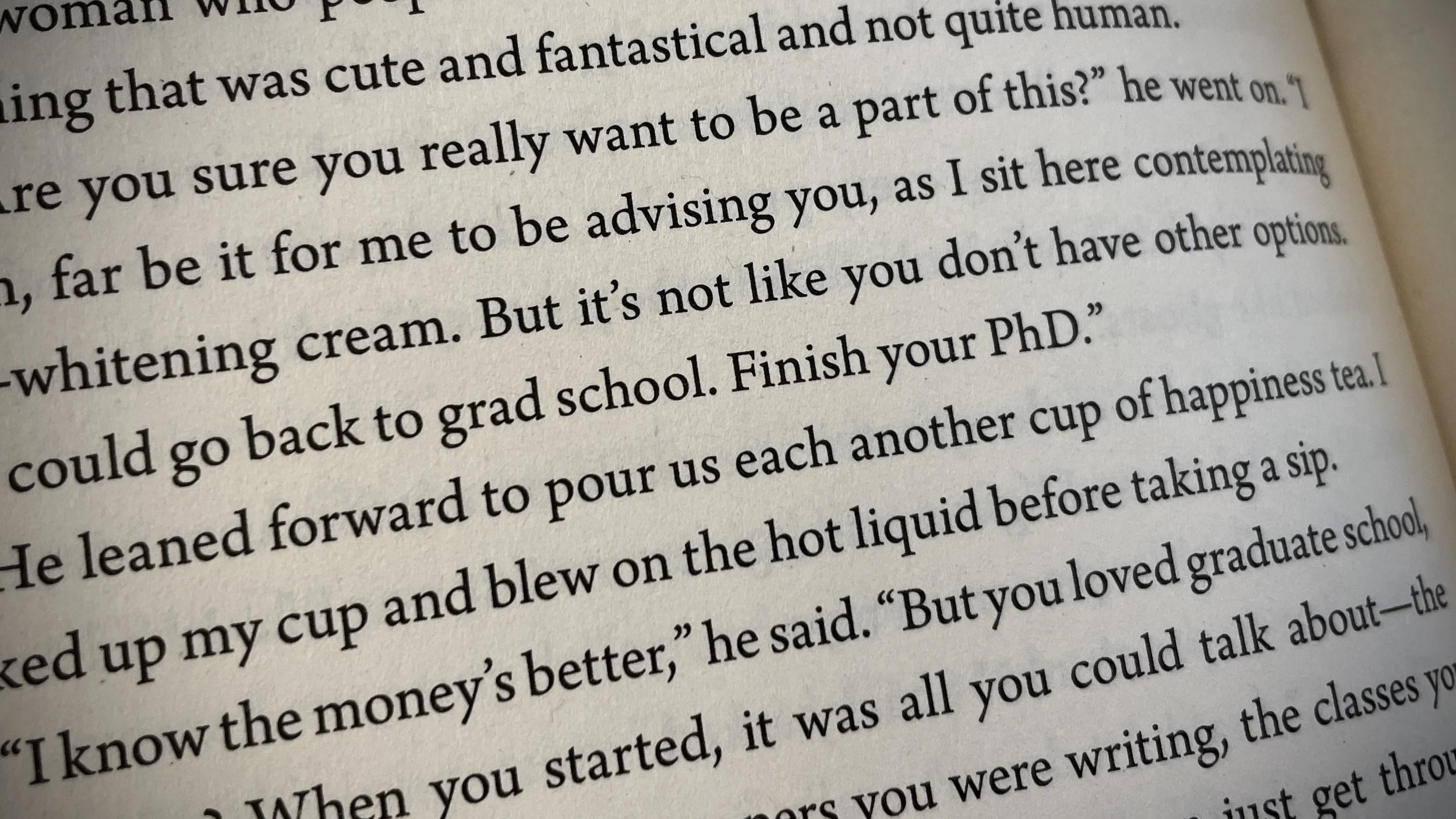I’m reading Happy for You by Claire Stanford, and in one scene, the protagonist’s best friend is giving her advice. He says, “You could go back to grad school. Finish your PhD” (158). (The protagonist is on leave from her philosophy PhD program while she works at a tech company.)