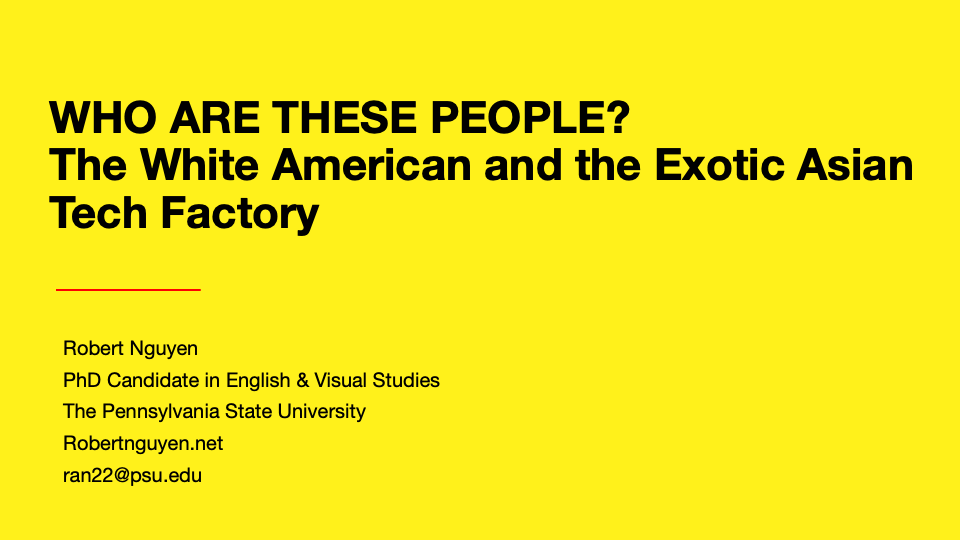 This paper argues that the depiction of the exoticized factory as the site of numerous wrongdoings—human rights abuses, counterfeiting, and corporate scheming—mediate Western anxieties over the consequences of globalized technology production in Asia specifically, a concern that is heightened by the massive growth of smartphone adoption during the 2010s and more recently expressed in conspiracy theories associating Chinese 5G networks with the coronavirus. I situate works by Daisey, Cohen, and others as techno-orientalist imaginaries that shortly precede increased US concerns over China’s rising economic and geopolitical power.